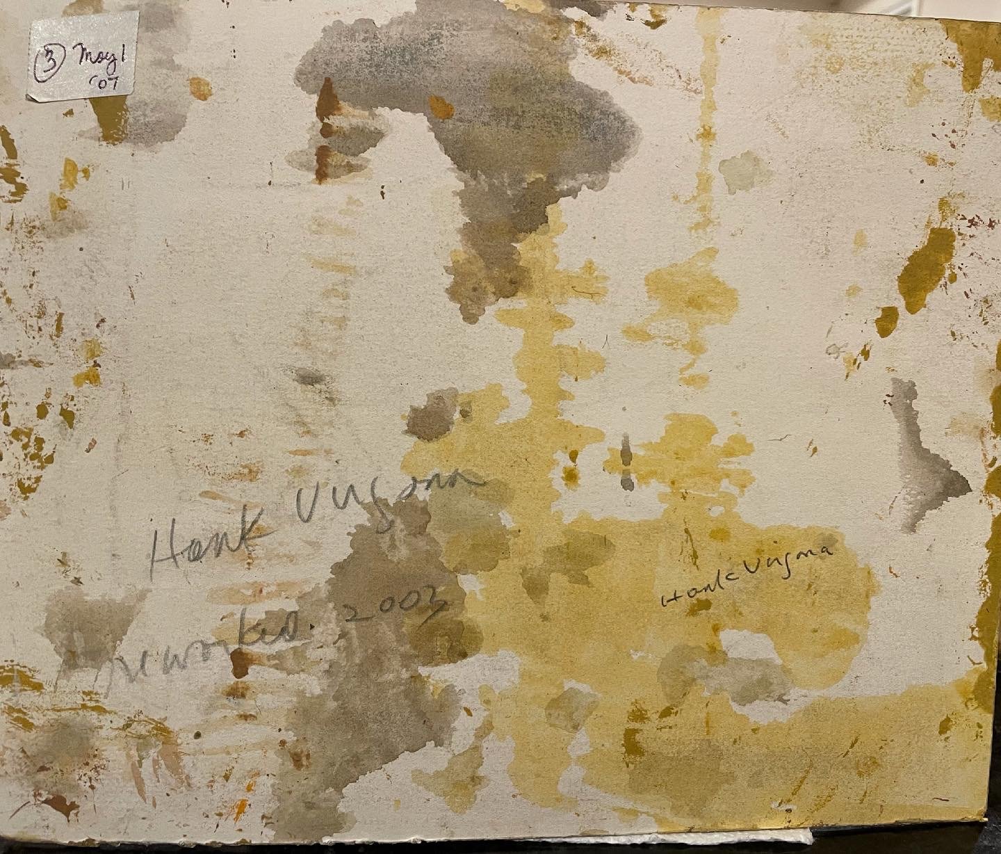 This is one of the most beautiful, original incised still life pear and pitcher works that Hank had in his collection. The browns, oranges, and yellows are vivid, yet calming. This makes you want to take a bite.