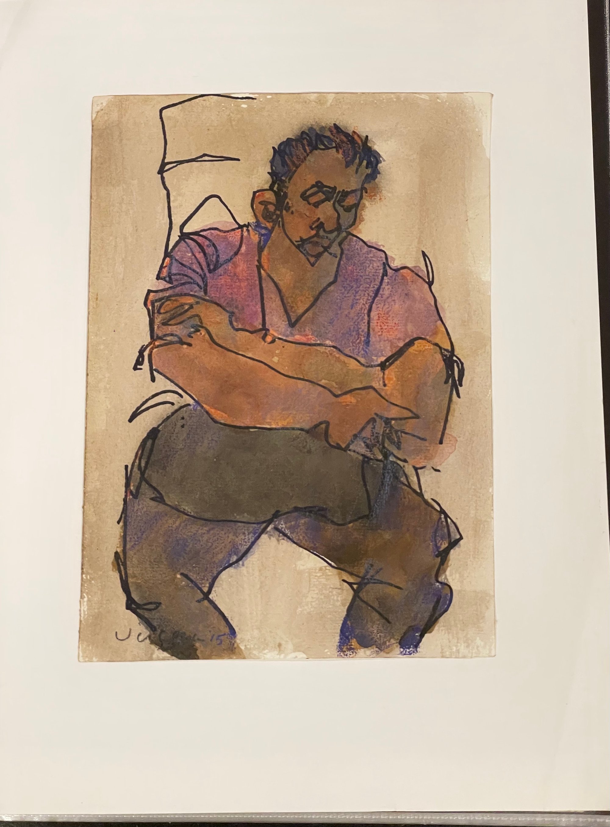 An original Hank Virgona watercolor subway sketch on art paper. He seemed to capture this rider's evening nap on the J-train, #3 in a series of resting passengers.