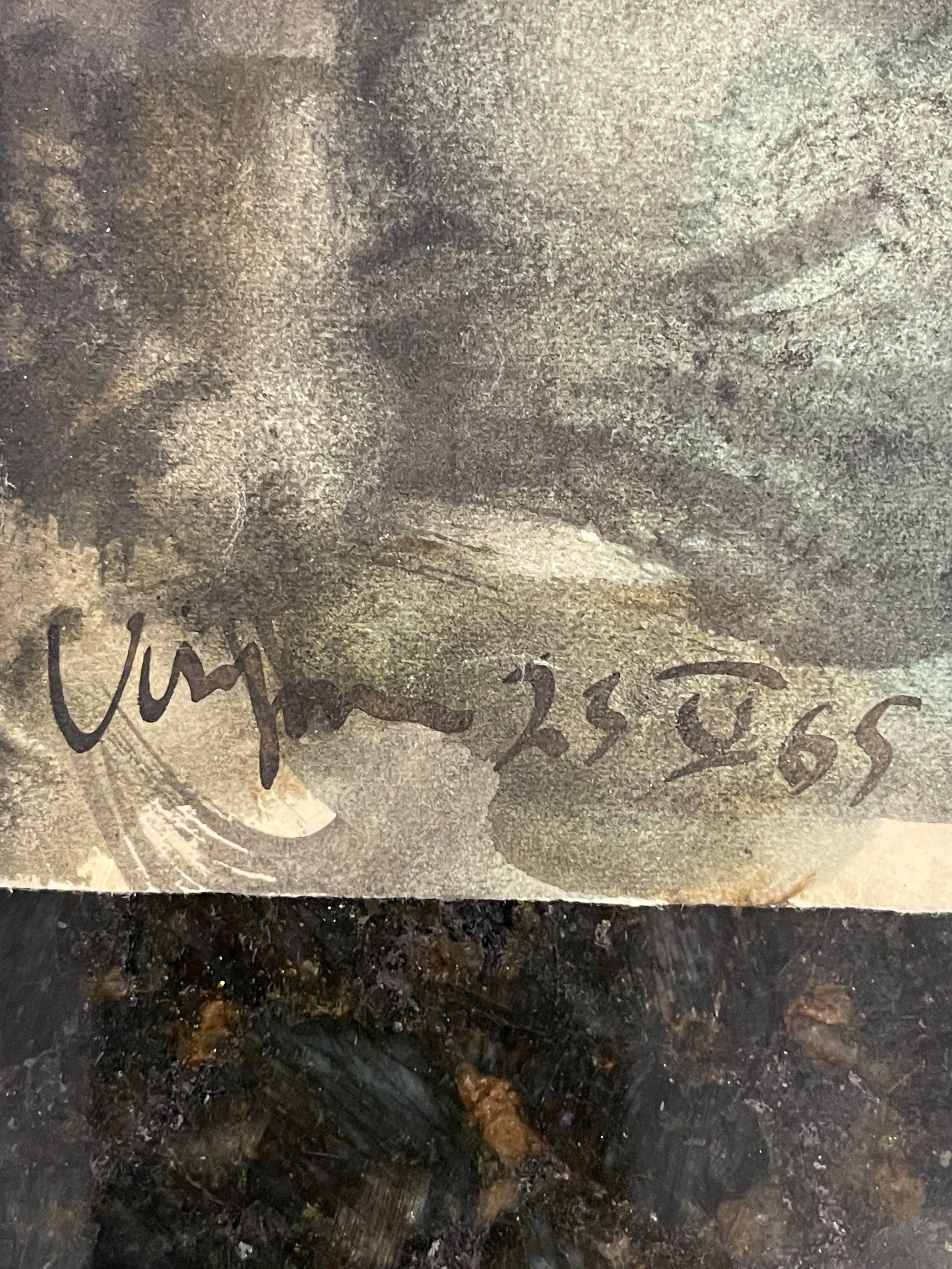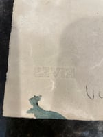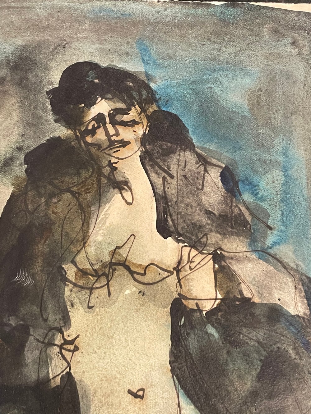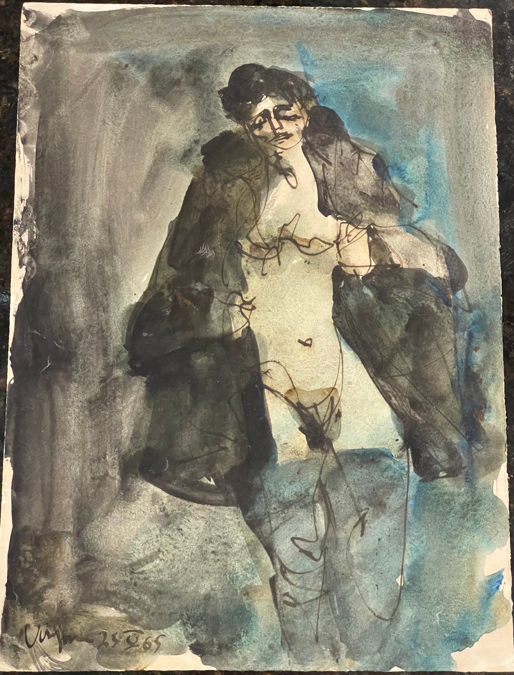 She got chilly during the modeling session. Early in Virgona’s career, he sketched nudes in his studio. Using his signature brown inkwell pen, he observed and sketched. Cobalt blue mixed with black and brown watercolors make this 1965 classic Virgona nude, absolutely gorgeous. Hank knew how to choose the colors that will dance when framed. This signed original painting measures 13”x9 1/4” approx on RIVES watermarked paper. Extremely high quality and rare. Excellent condition and signed on back as well.