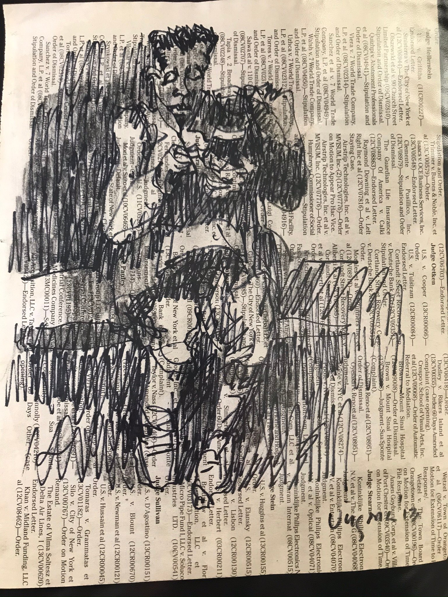 “Twitter Me Silly” (2013) 10 x 7 13/16” This could be a close self portrait of Virgona but is not. This man is Tweeting, fingers typing quickly on his smartphone. Did he miss his stop? Virgona captured this gesture on the R-train on his way to his Union Square studio with the NY Law Journal as the background.